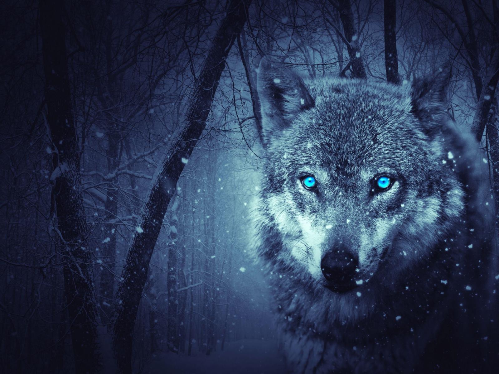 Обои Серый волк с голубыми глазами в холодном зимнем лесу
