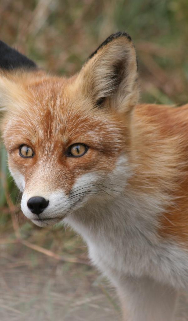 Обои Хитрый взгляд большой рыжей лисы с черным носом