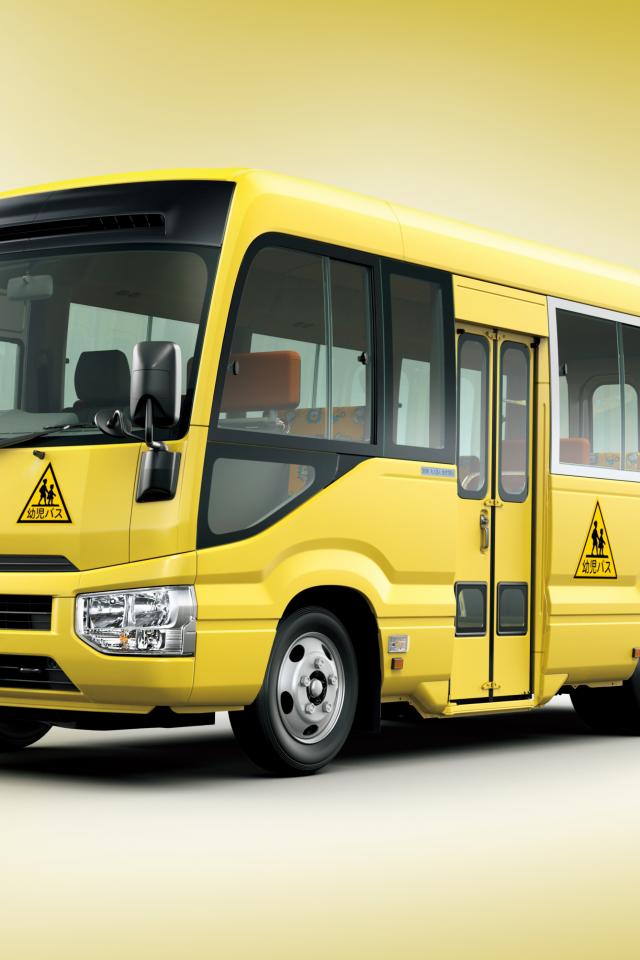 Обои Желтый школьный автобус Toyota Coaster, 2017