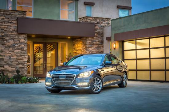 Обои Серебристый автомобиль Genesis G80 с включенными фарами