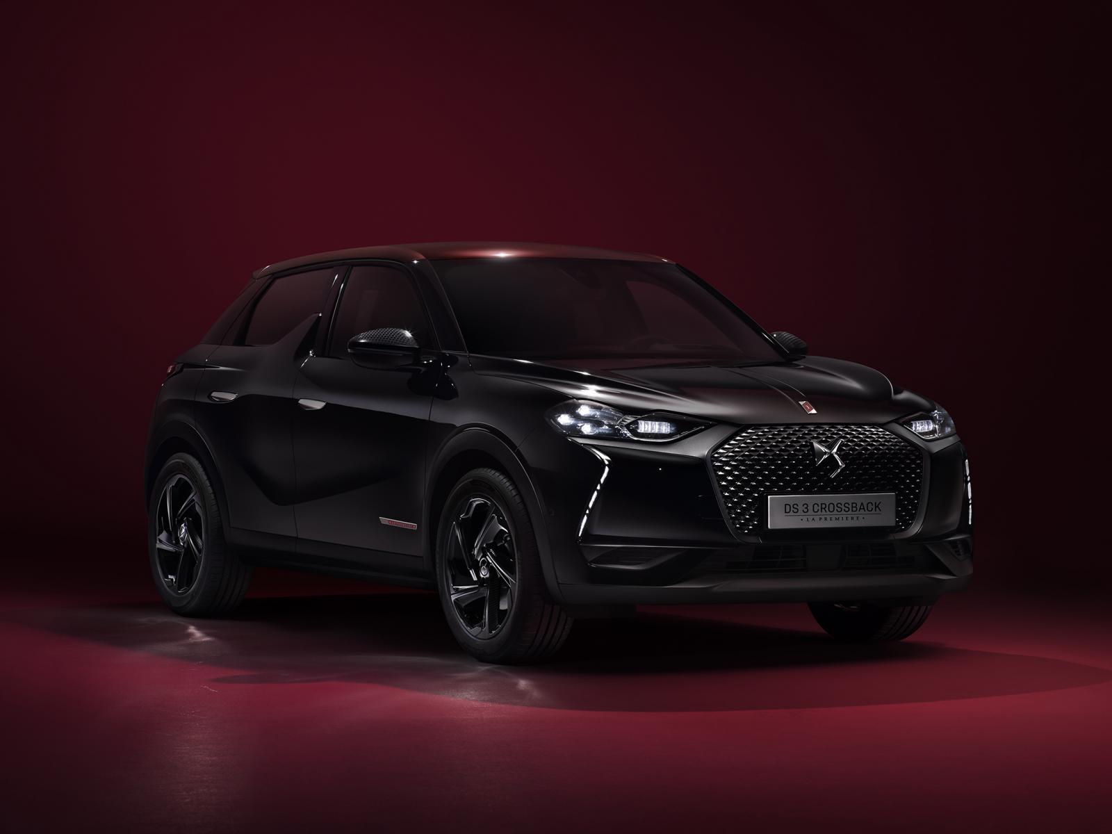 Обои Черный стильный автомобиль DS 3 2019 года на бордовом фоне