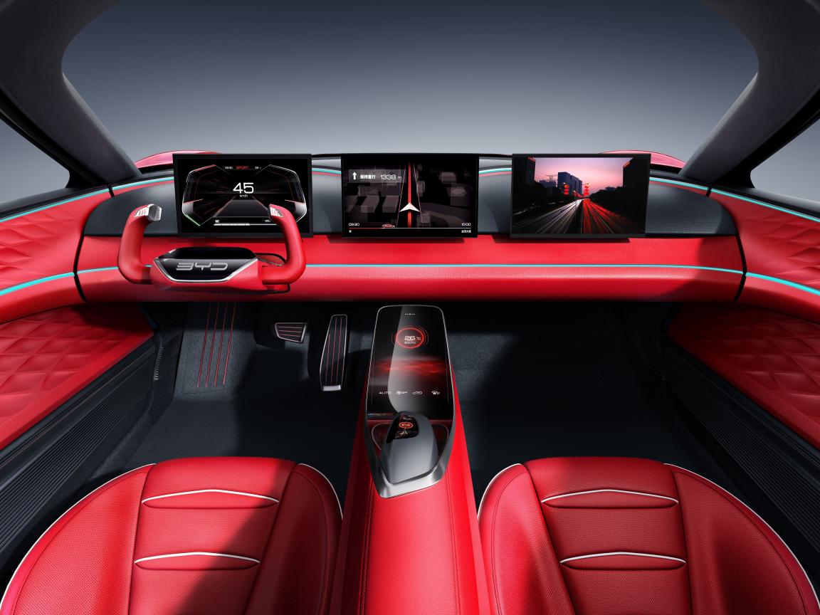 Обои Красный кожаный салон автомобиля BYD E-SEED GT, 2019