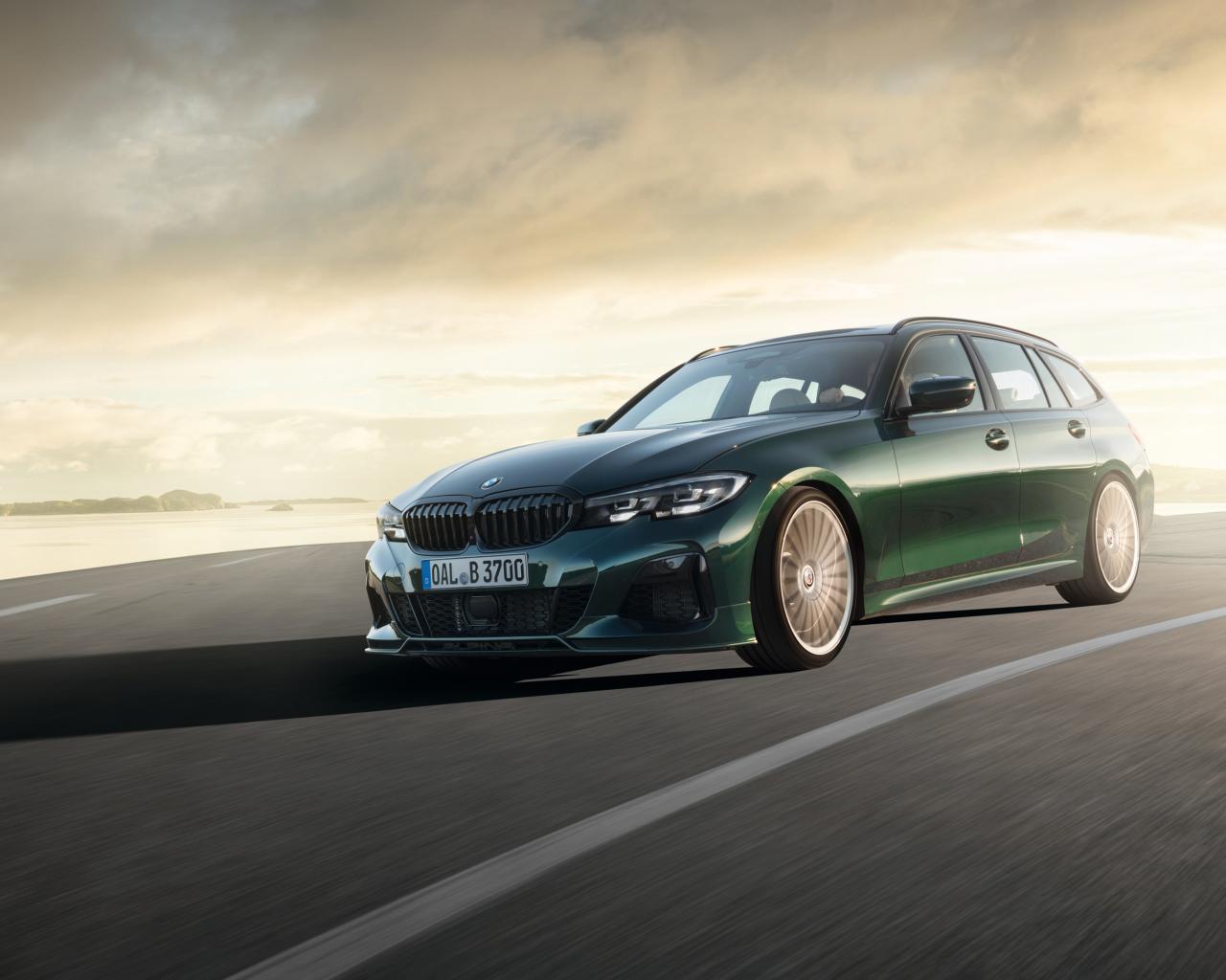 Обои Зеленый автомобиль Alpina B3 Touring 2019 года на дороге