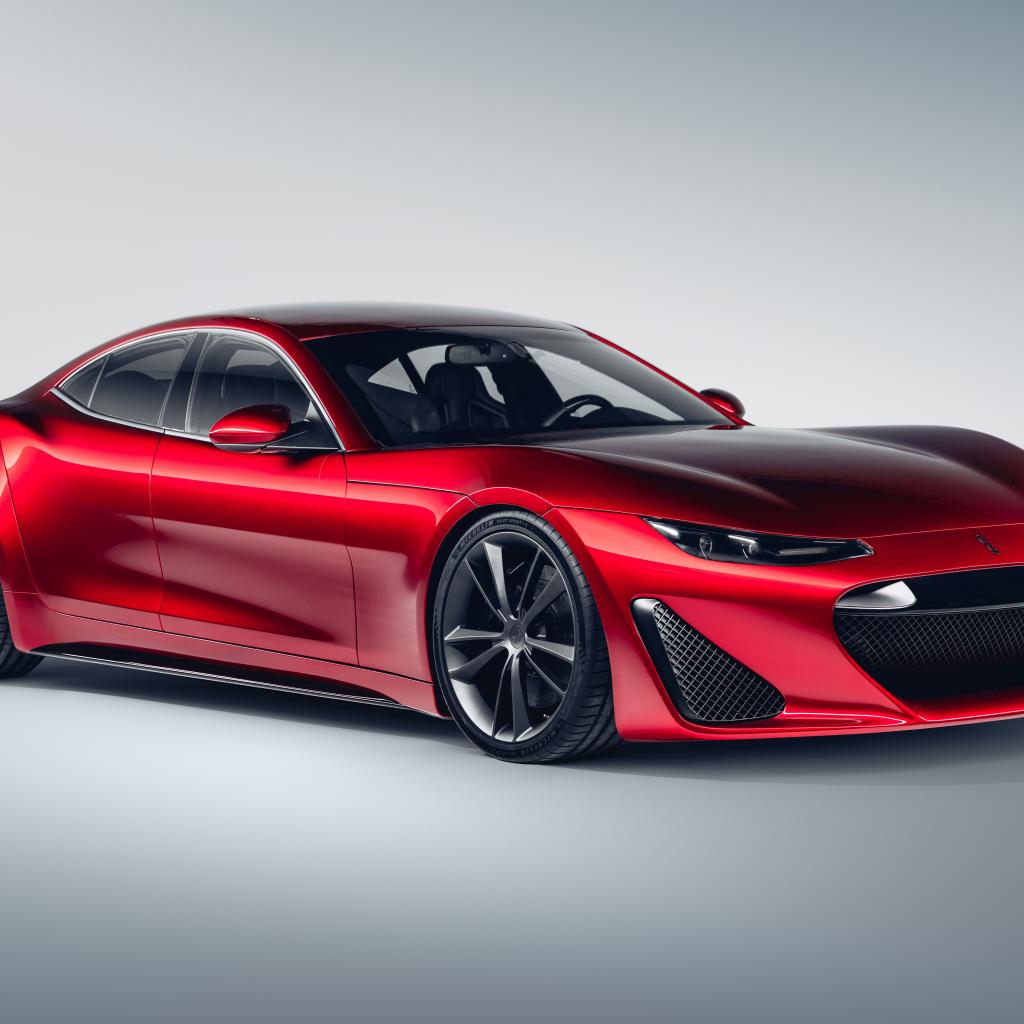 Обои Красный автомобиль Drako GTE, 2020 года на сером фоне вид спереди