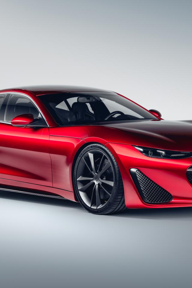 Обои Красный автомобиль Drako GTE, 2020 года на сером фоне вид спереди