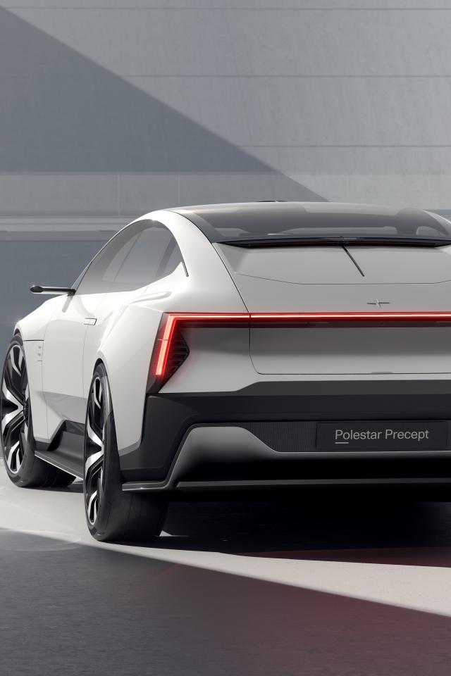Обои Серебристый автомобиль Polestar Precept 2020 года на фоне серой стены