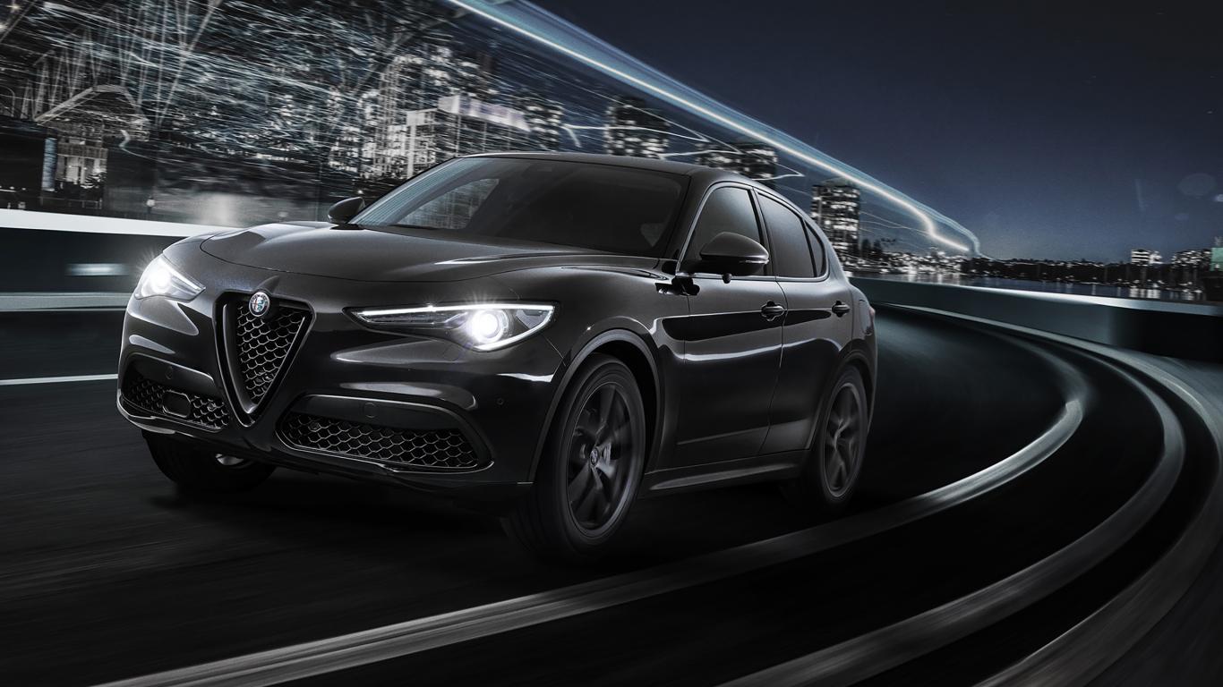 Обои Черный автомобиль Alfa Romeo Stelvio, 2019 года на трассе