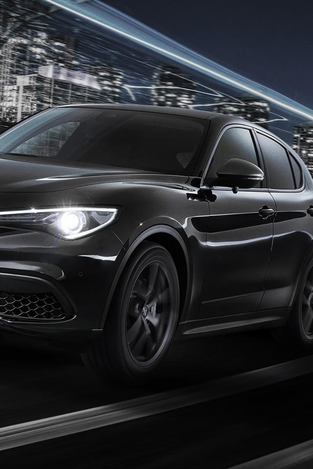 Обои Черный автомобиль Alfa Romeo Stelvio, 2019 года на трассе