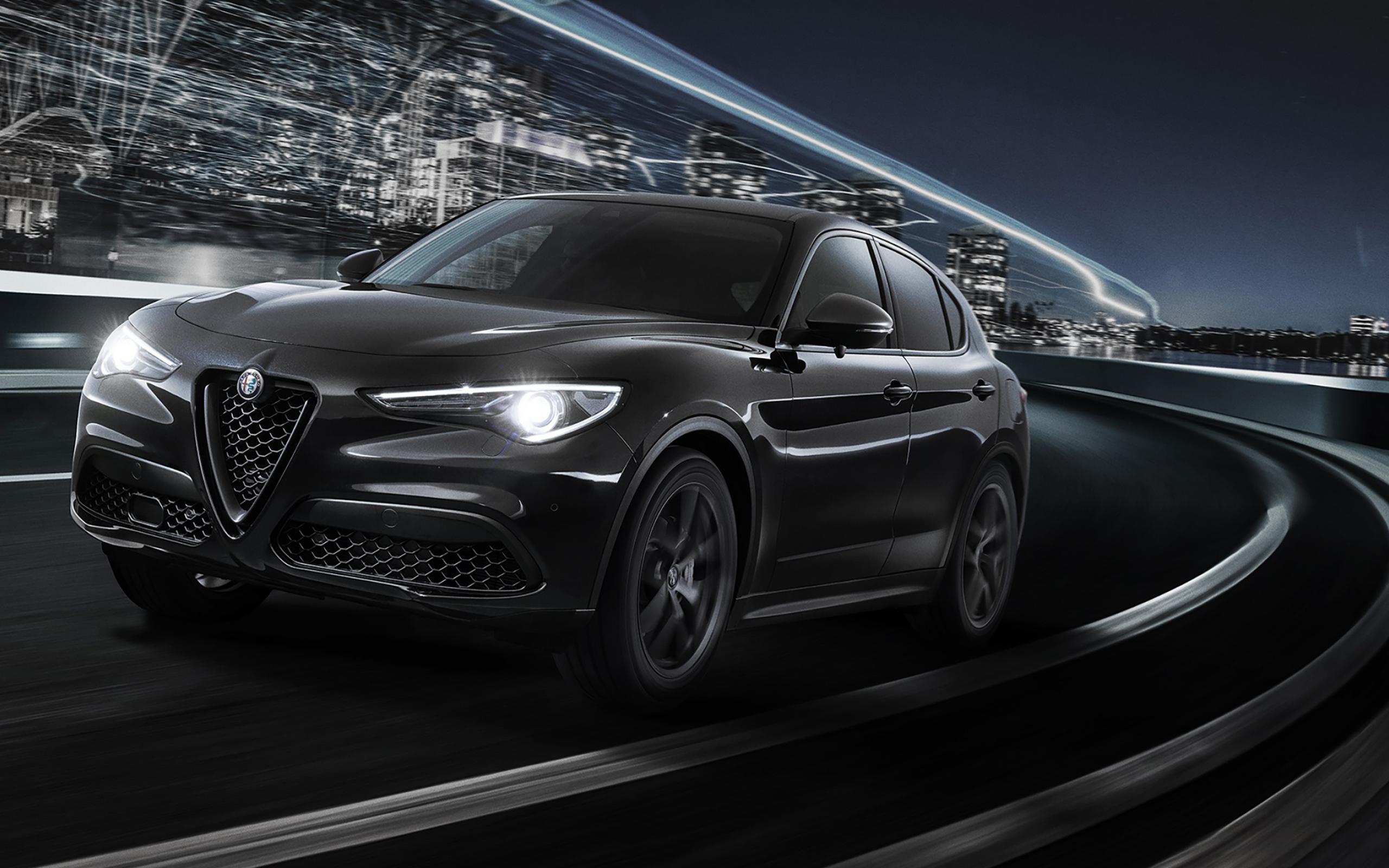 Обои Черный автомобиль Alfa Romeo Stelvio, 2019 года на трассе