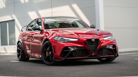 Обои Красный автомобиль Alfa Romeo Giulia GTAm 2020 года у гаража