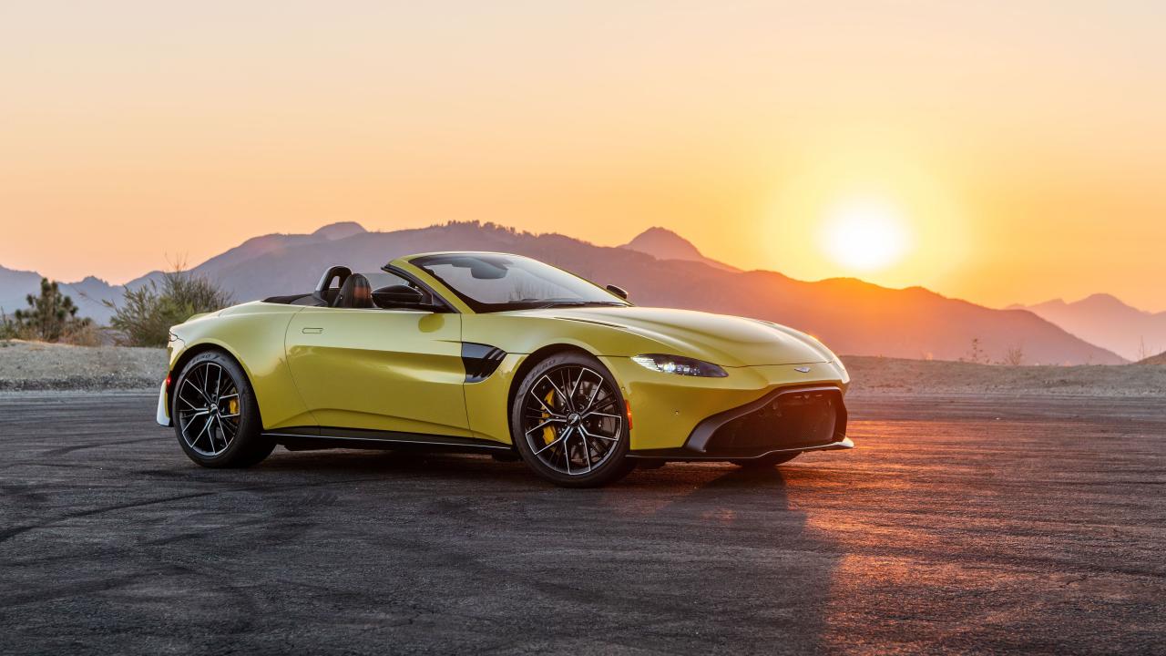 Обои Желтый автомобиль Aston Martin Vantage Roadster, 2021 года на закате