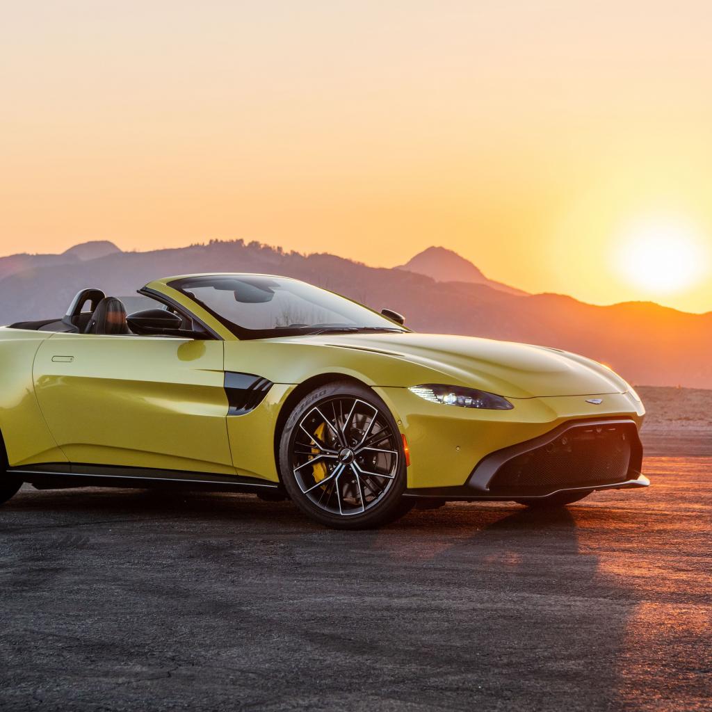 Обои Желтый автомобиль Aston Martin Vantage Roadster, 2021 года на закате