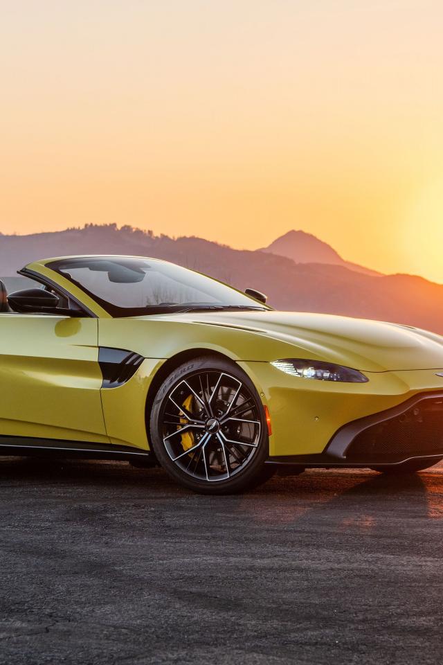 Обои Желтый автомобиль Aston Martin Vantage Roadster, 2021 года на закате