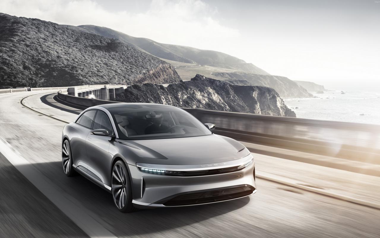 Обои Серебристый электрокар Lucid Air на трассе