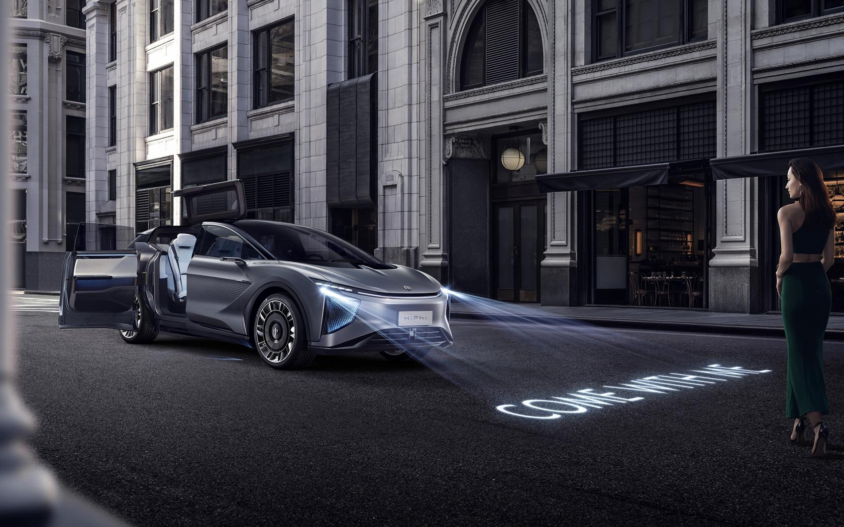 Обои Серебристый электрокроссовер HiPhi 1, 2020 года на улице города