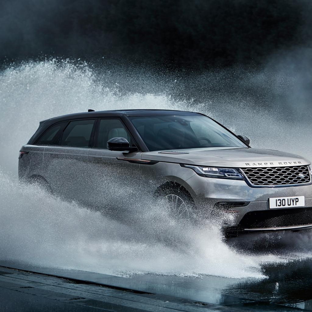 Обои Серый автомобиль Range Rover Velar, 2017 проезжает по воде