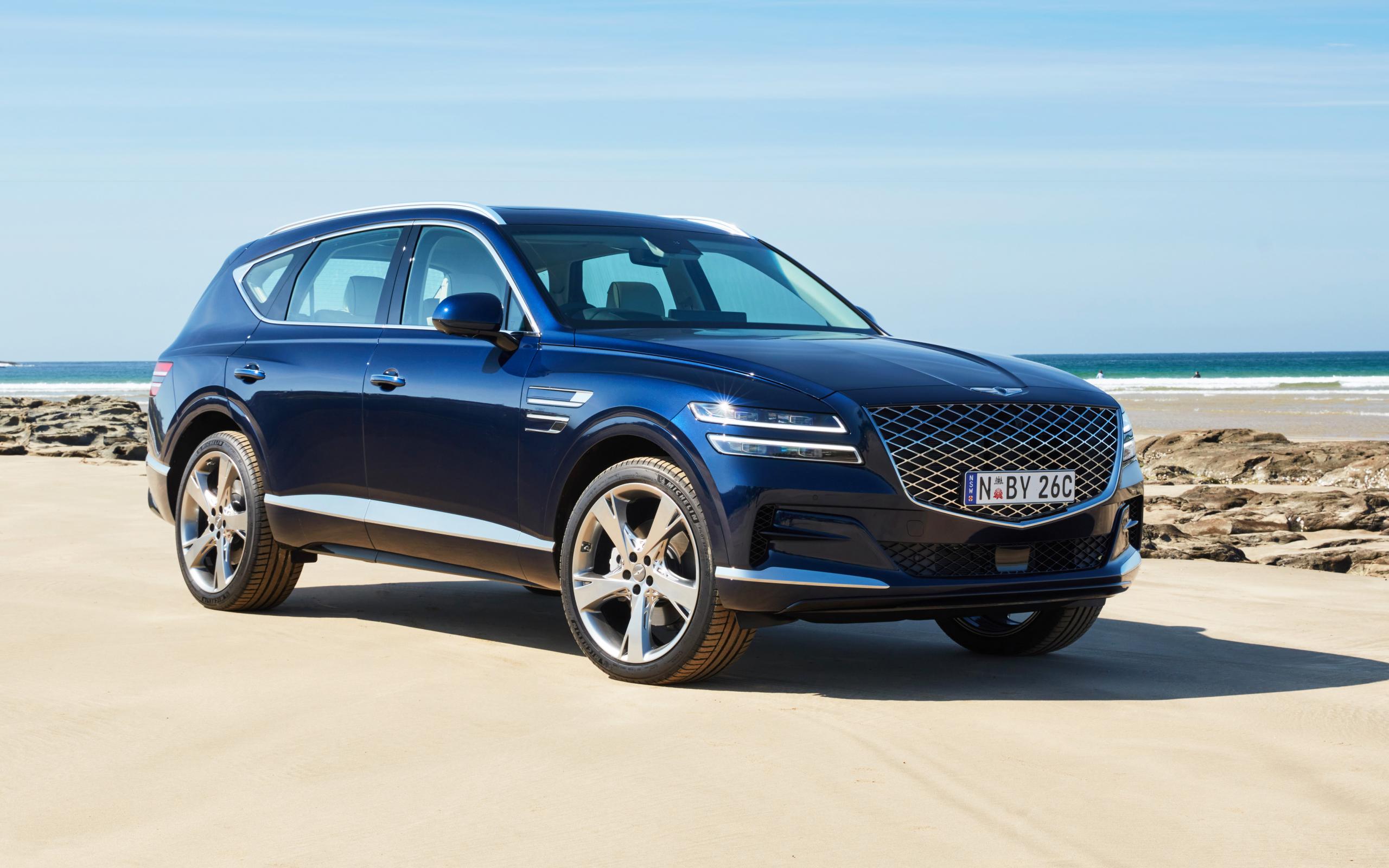 Обои Синий автомобиль Genesis GV80 2.5T 2020 года у океана
