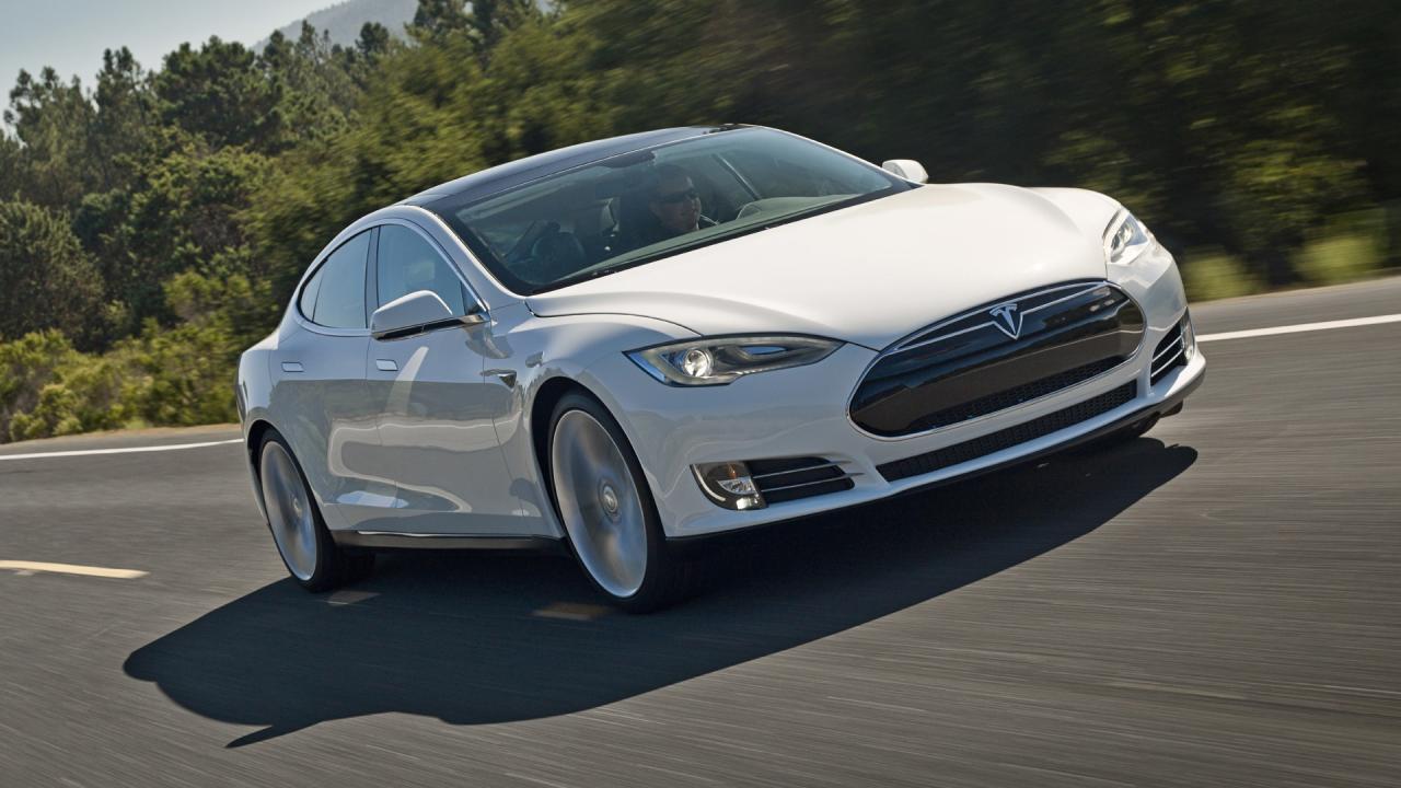 Обои Белоснежный электромобиль Тесла на трассе