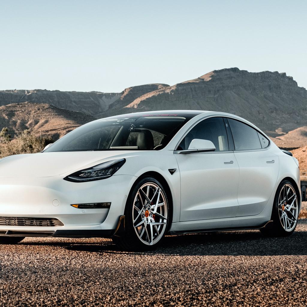 Обои Белый автомобиль Tesla Model 3 Volta 2019 года на фоне гор