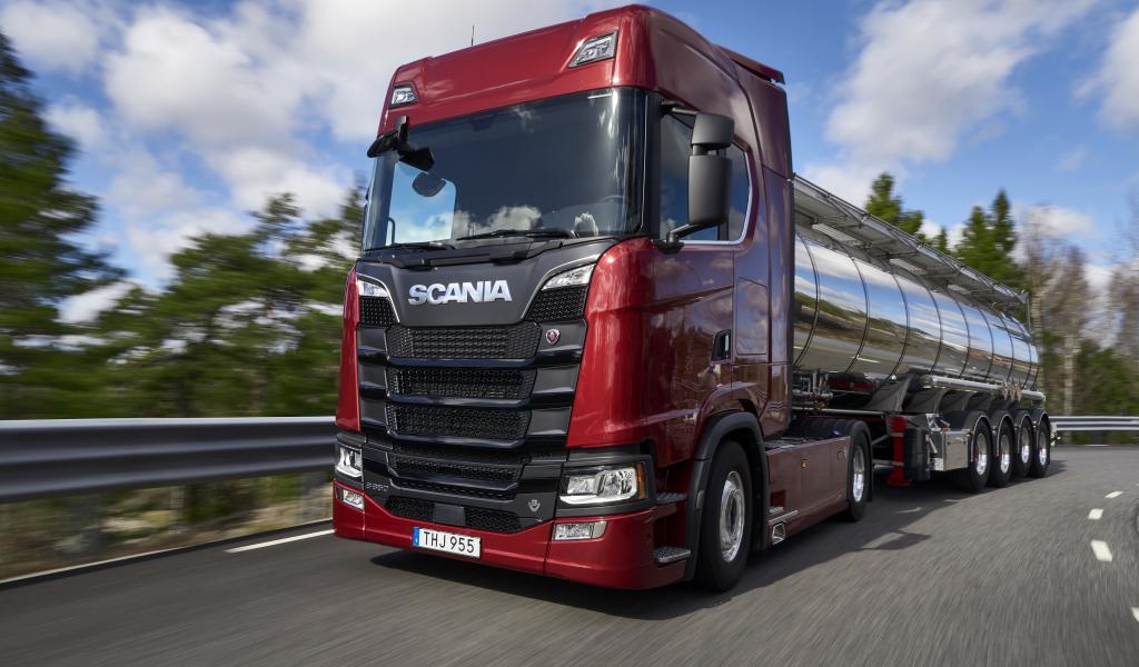 Обои Красный грузовой автомобиль Scania S 650 на трассе
