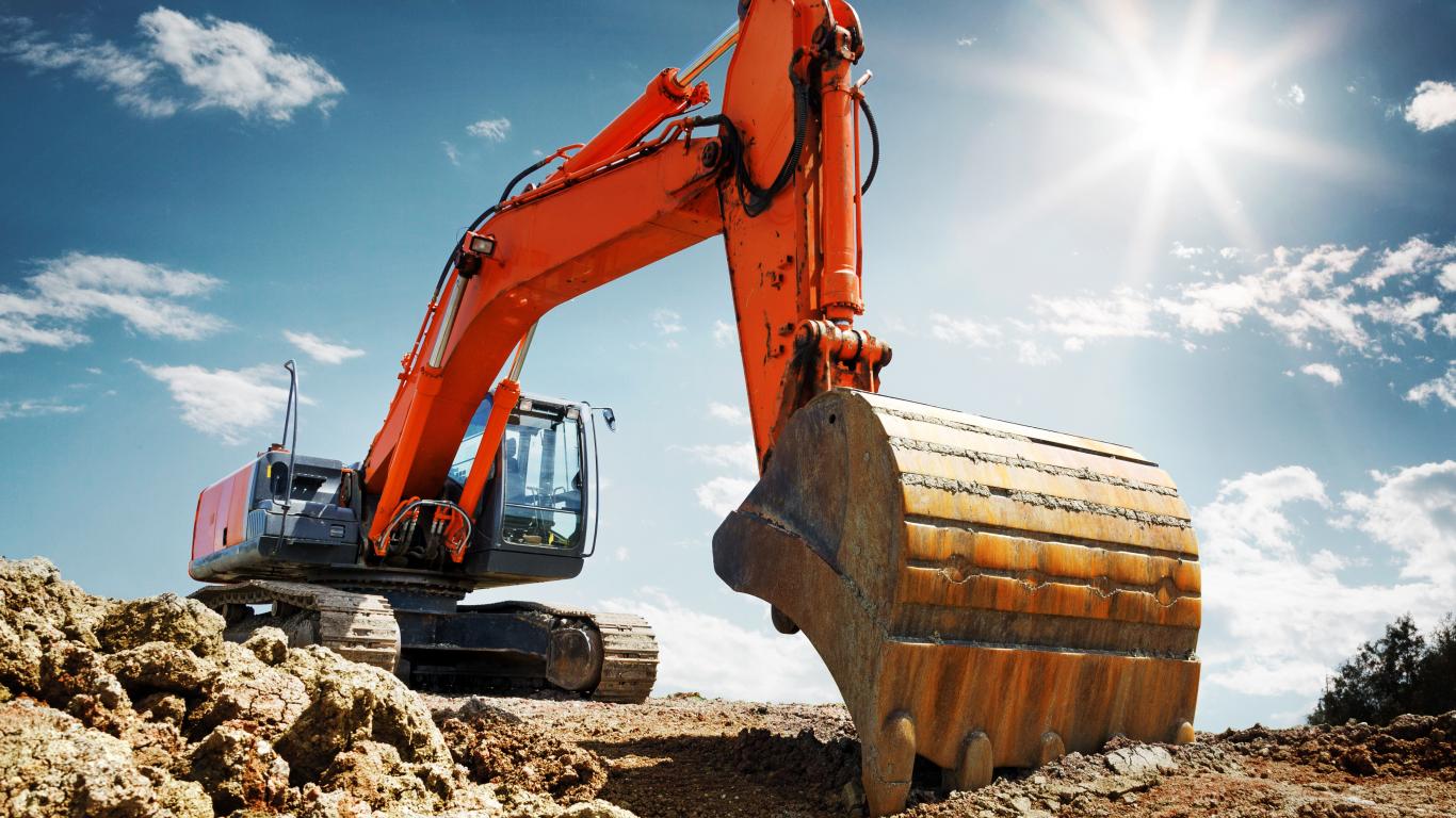 Обои Экскаватор с ковшом на фоне голубого неба