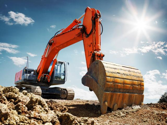 Обои Экскаватор с ковшом на фоне голубого неба
