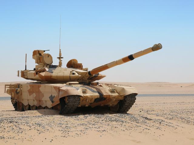 Обои Танк T-90 в пустыне на фоне голубого неба
