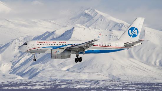 Обои Самолет ТУ 204-300 авиакомпании Владивосток Авиа пролетает над горами Алтая