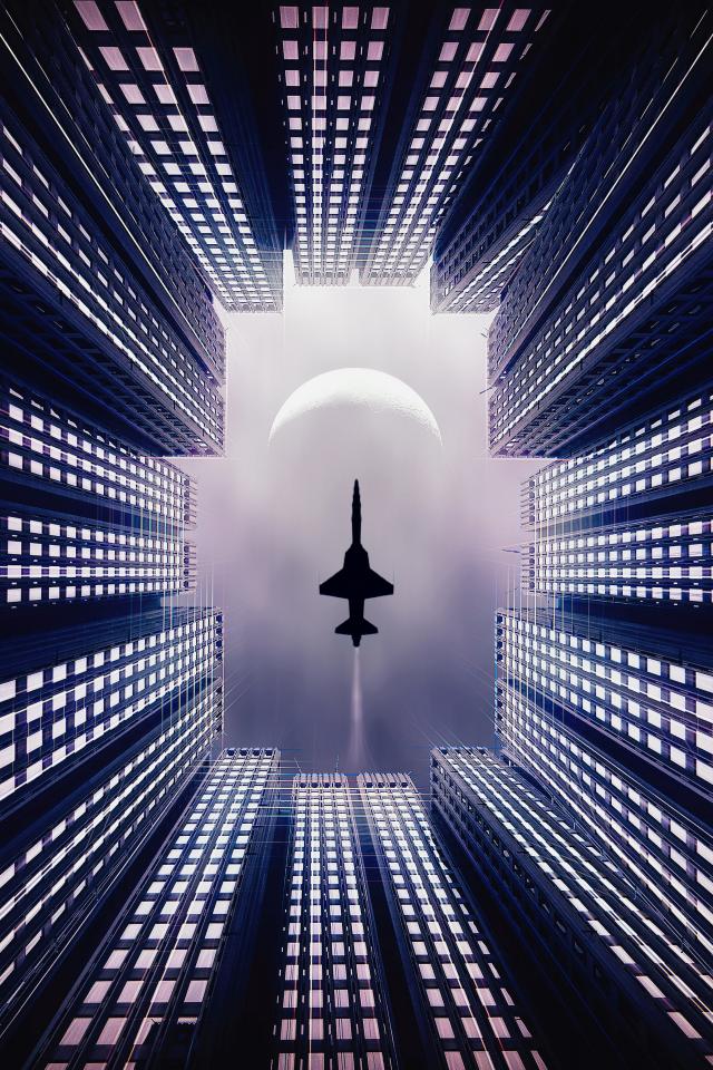 Обои Самолет летит над небоскребами