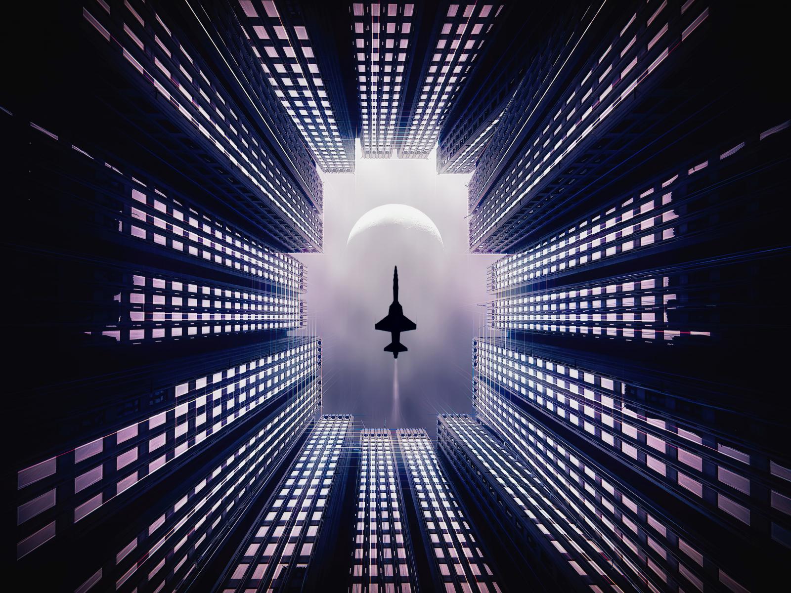 Обои Самолет летит над небоскребами
