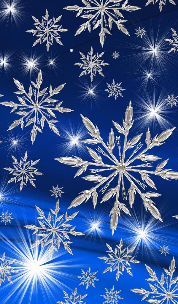 Обои Ярки звезды и белые снежинки на голубом фоне