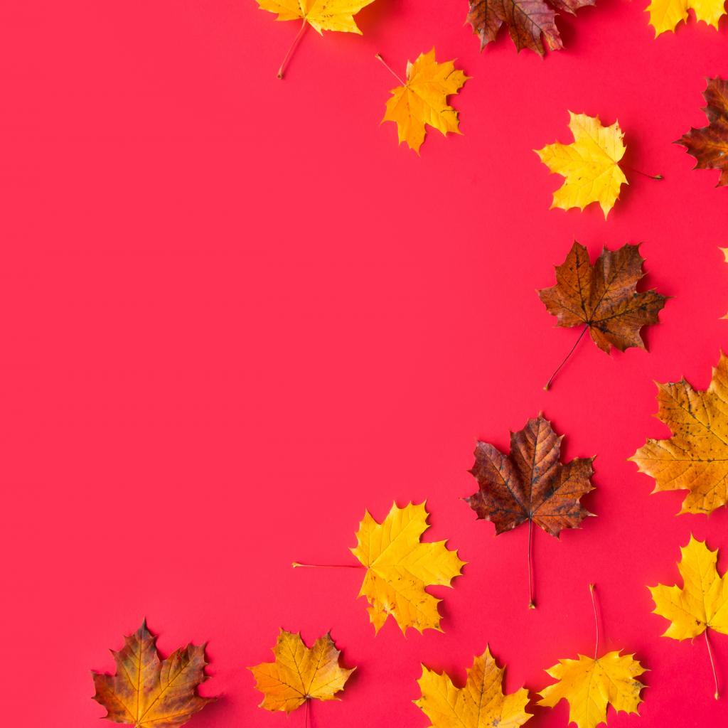 Обои Опавшие осенние кленовые листья на красном фоне