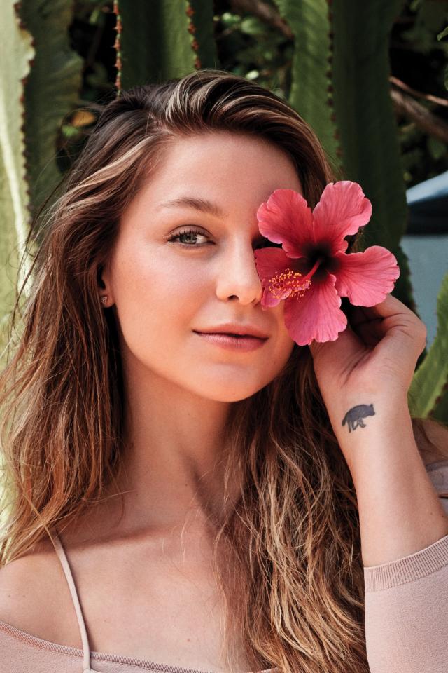 Обои Красивая девушка актриса Мелисса Бенойст с цветком