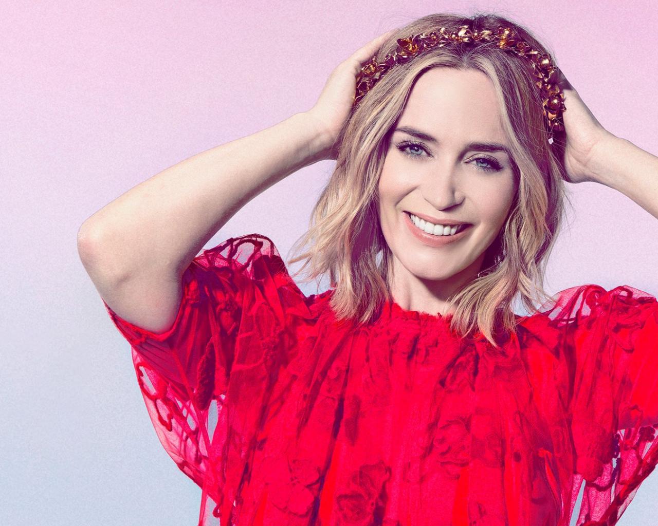 Обои Голубоглазая актриса Эмили Блант в красном платье