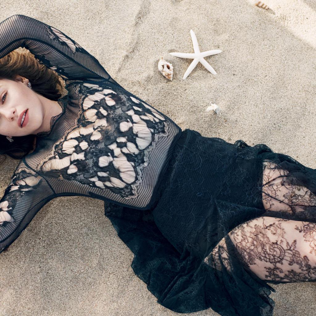Обои Актриса брюнетка Эмилия Кларк лежит на песке