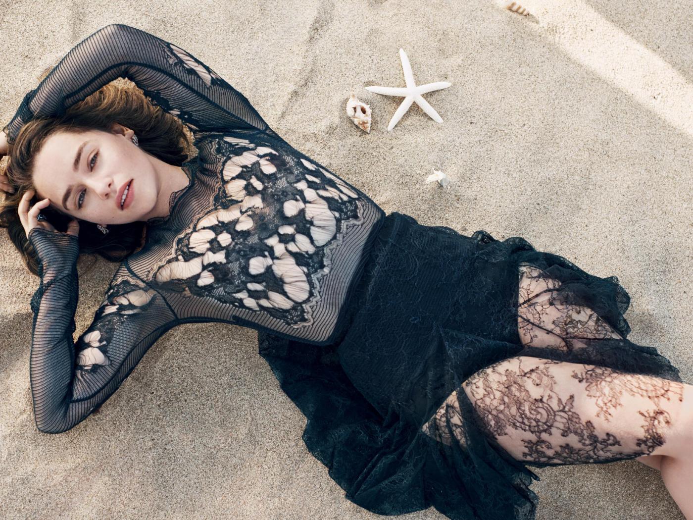 Обои Актриса брюнетка Эмилия Кларк лежит на песке