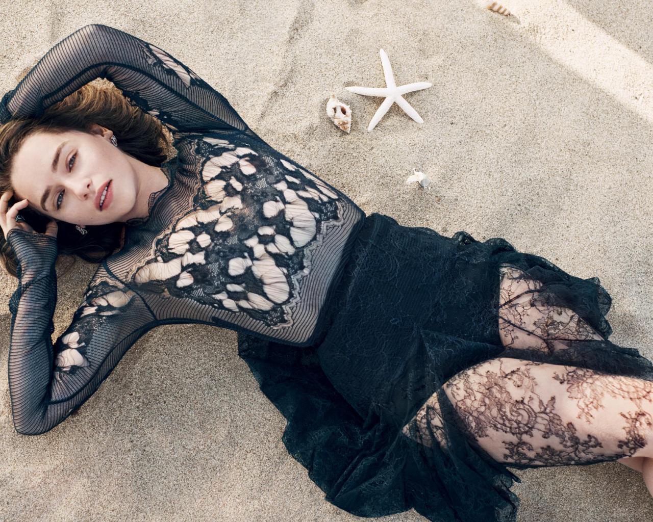 Обои Актриса брюнетка Эмилия Кларк лежит на песке