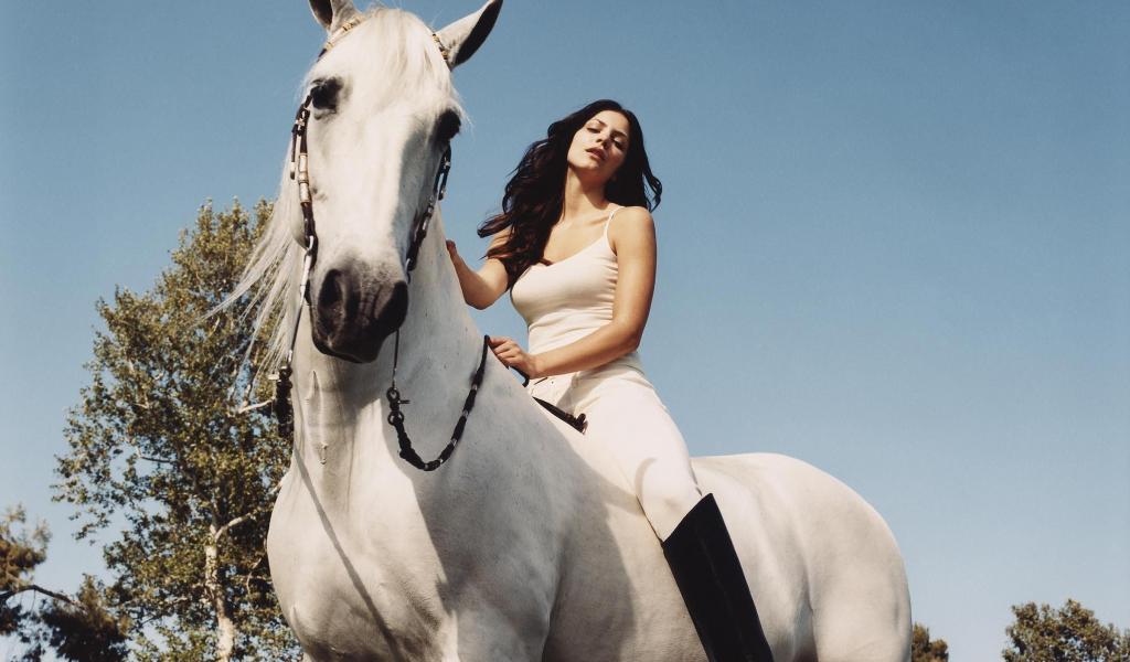 Обои Молодая актриса Кэтрин Макфи на белой лошади