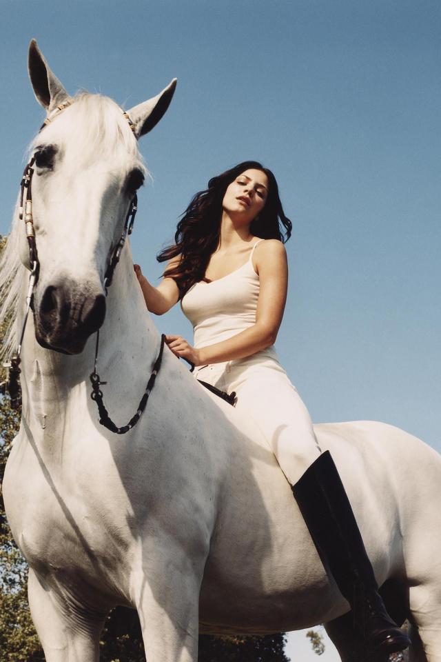 Обои Молодая актриса Кэтрин Макфи на белой лошади