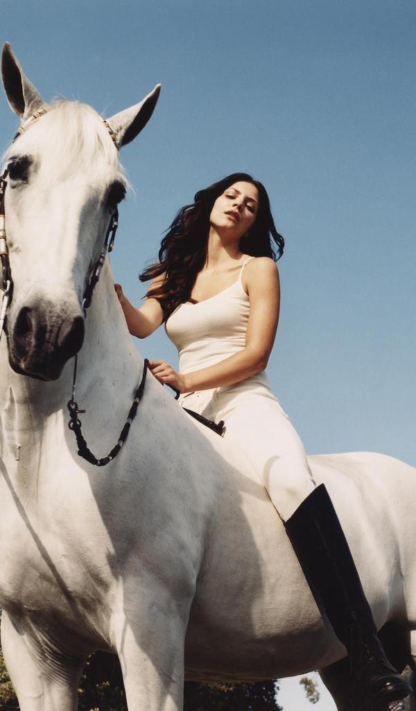 Обои Молодая актриса Кэтрин Макфи на белой лошади