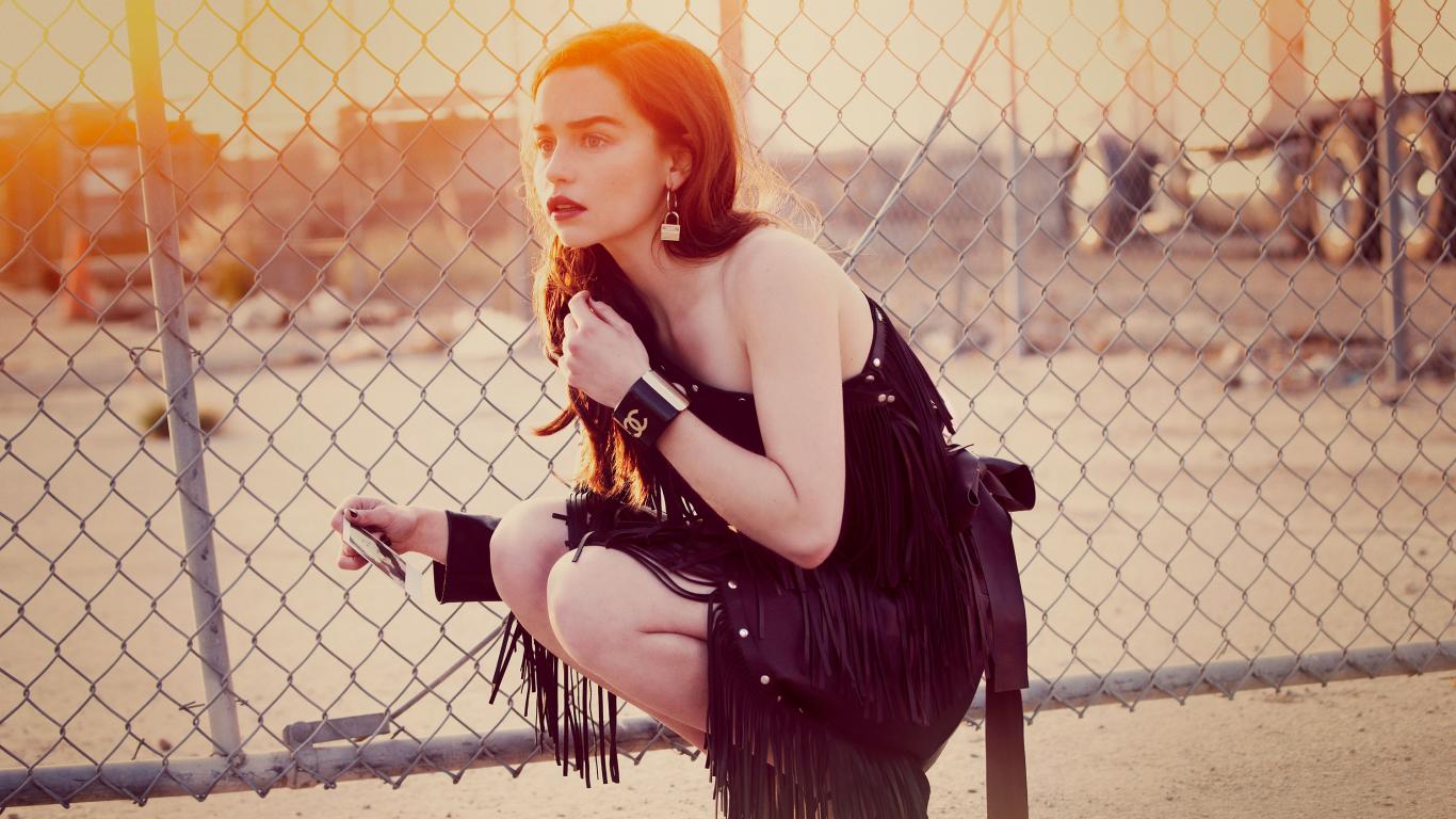 Обои Актриса Эмилия Кларк в красивом черном платье в лучах солнца