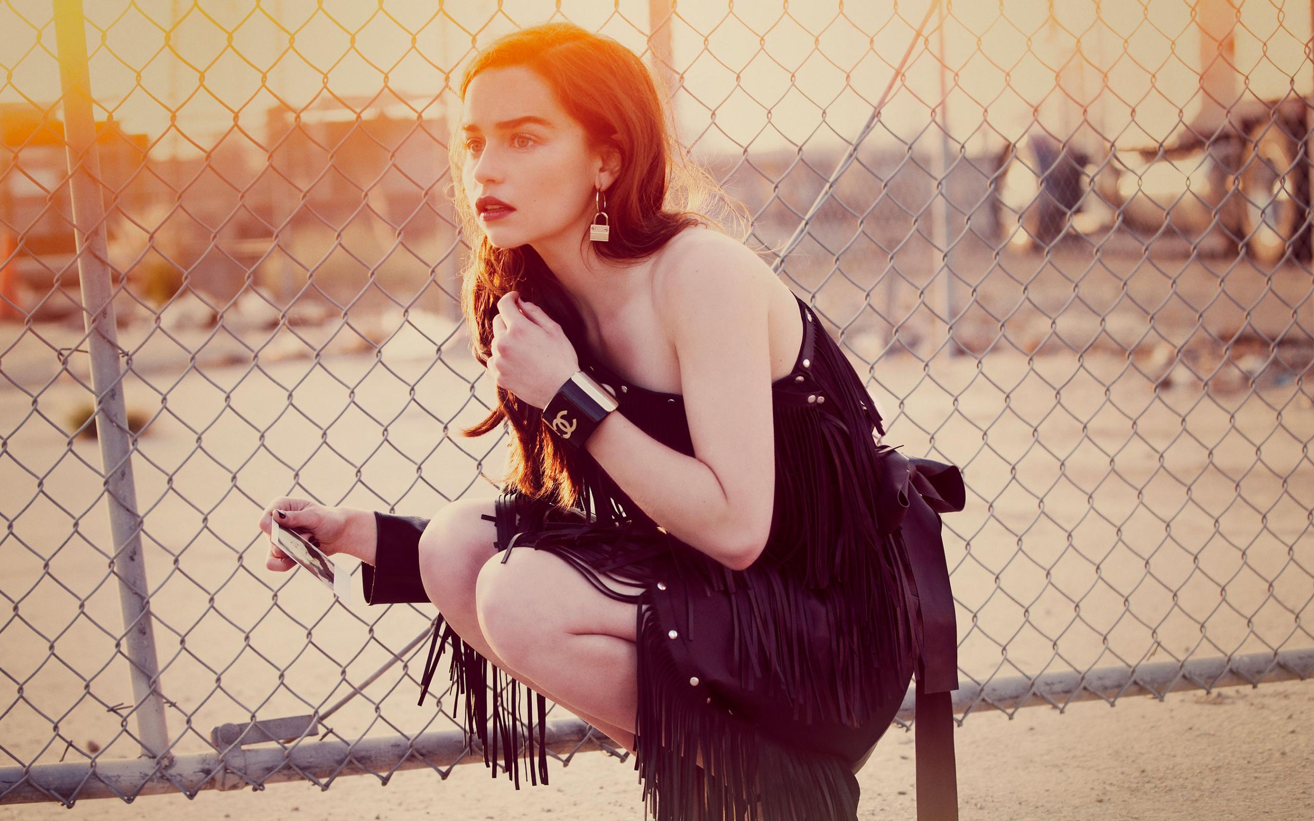 Обои Актриса Эмилия Кларк в красивом черном платье в лучах солнца