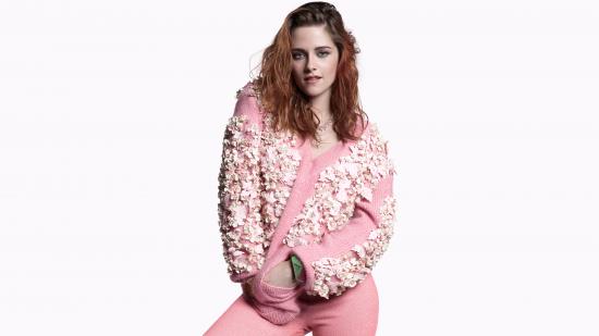 Обои Актриса Кристен Стюарт в розовом костюме на белом фоне