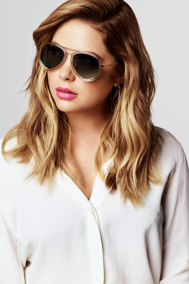 Обои Актриса Эшли Бенсон в черных очках на сером фоне