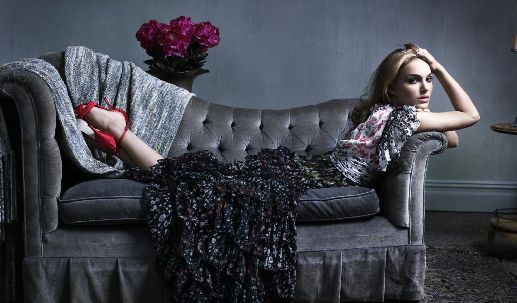 Обои Актриса Натали Портман лежит в красных туфлях на диване