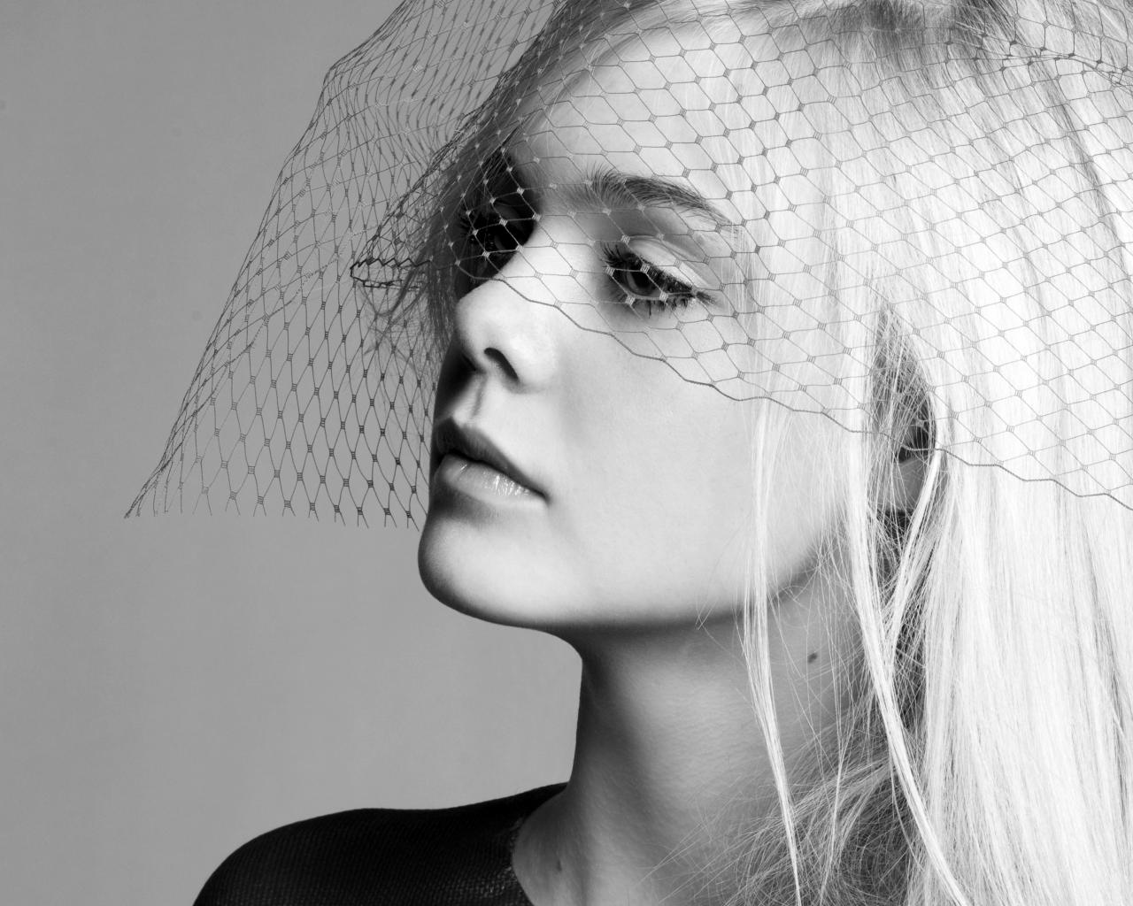 Обои Актриса Эль Фэннинг с вуалью на лице черно-белое фото