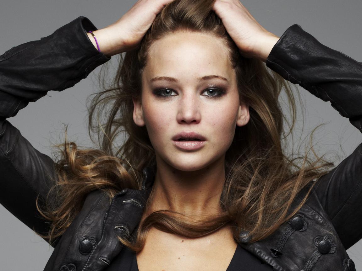Обои Актриса Дженнифер Лоуренс в черной кожаной куртке