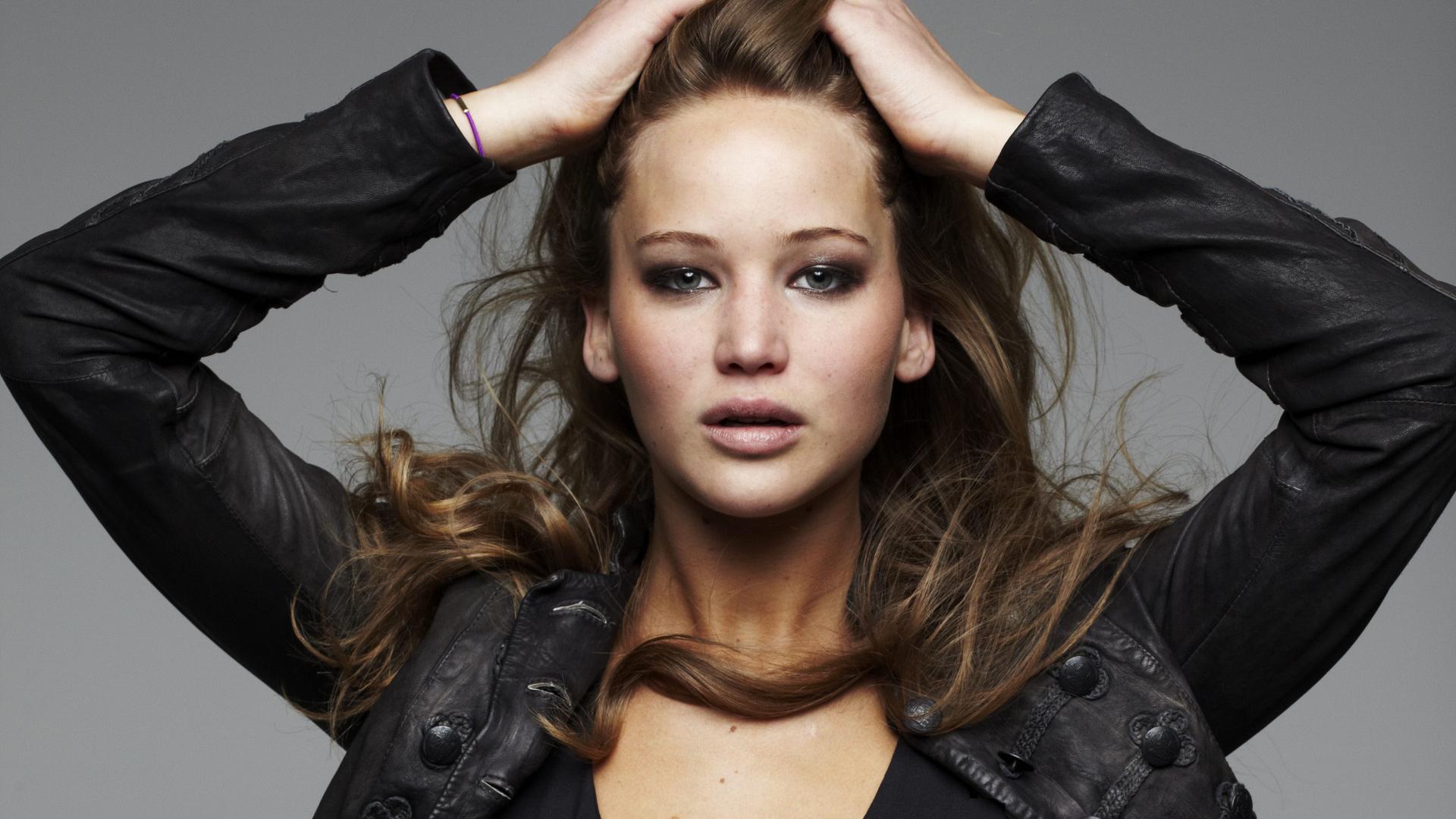 Обои Актриса Дженнифер Лоуренс в черной кожаной куртке