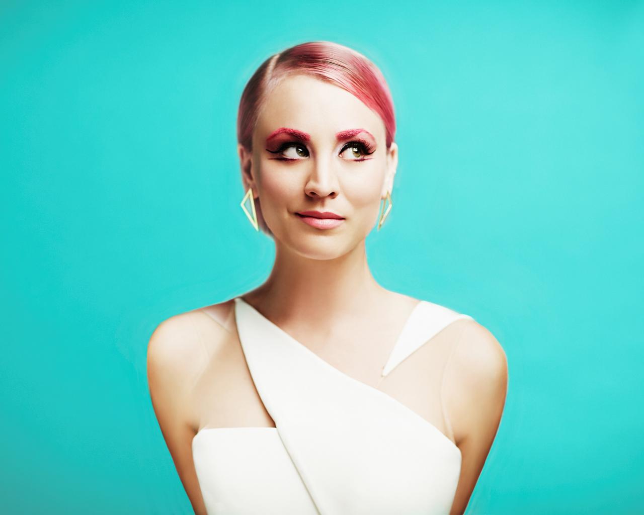 Обои Актриса Кейли Куоко с ярким макияжем на голубом фоне