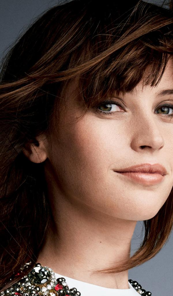 Обои Улыбающаяся актриса Фелисити Джонс на сером фоне